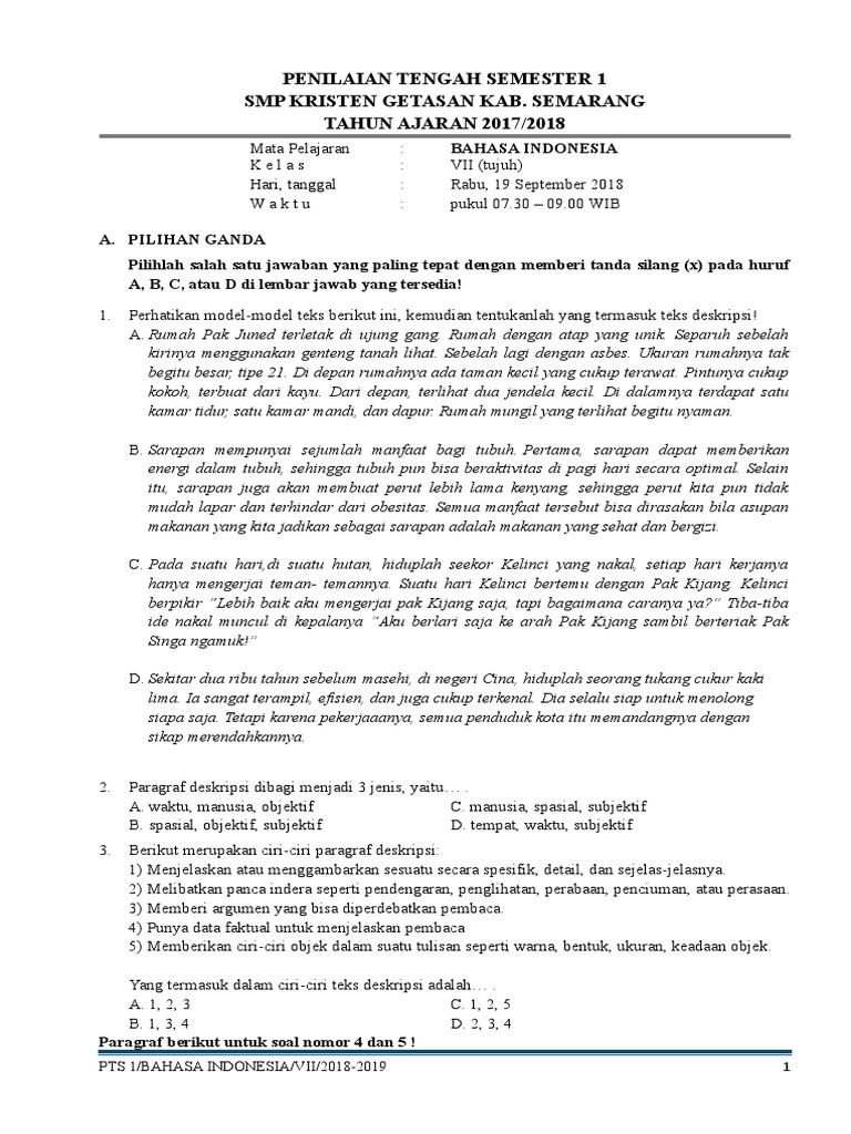 Soal Pilihan Ganda Teks Deskripsi Kelas 7 Dan Jawabannya - Soal Bahasa Indonesia Kelas 7 Smp Mts 2021 Semester 1 Dan 2 - Latihan soal materi buku fiksi dan nonfiksi kelas viii.. Setiap orang memiliki perbedaan dalam pemilihan bahan untuk dibaca. 2) daya tarik yang ditawarkan di tempat ini adalah pemandangan matahari saat terbit dan terbenam kunci soal pendalaman pilihan ganda 1. Latihan soal penilaian akhir semester 2019 bahasa indonesia. Internet pertama kali digunakan oleh. Materi sebelumnya 5 soal dan jawaban essay tentang pemanasan global.